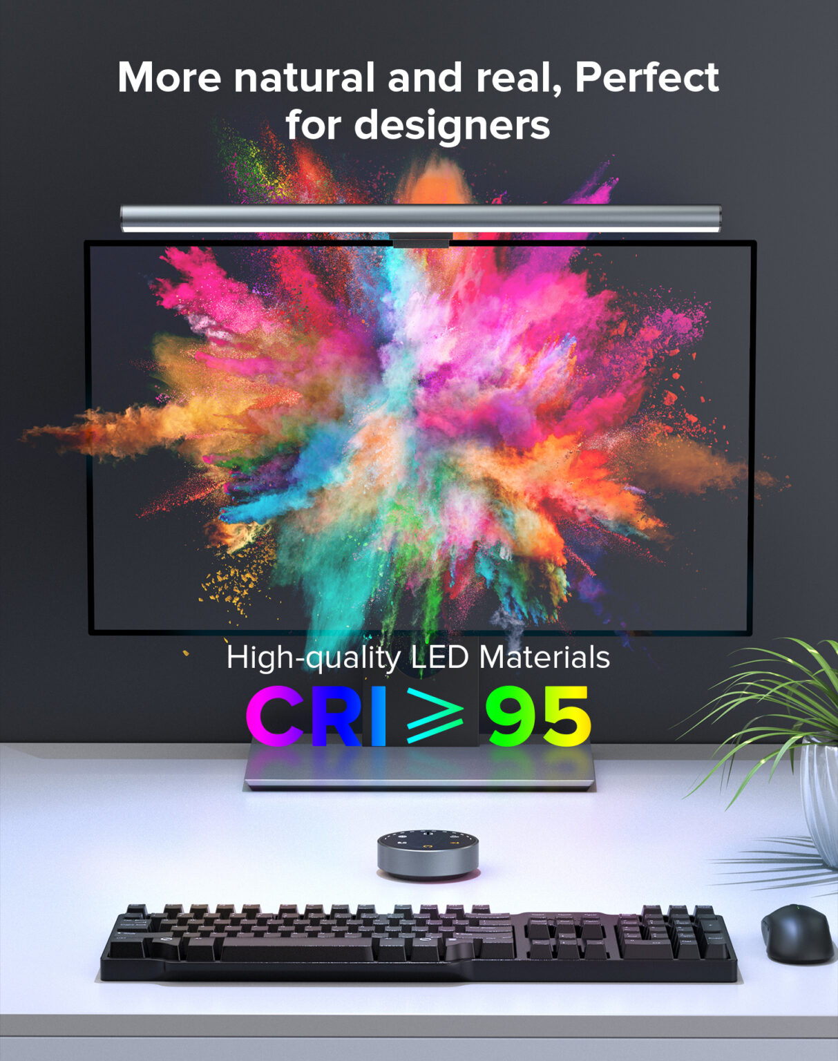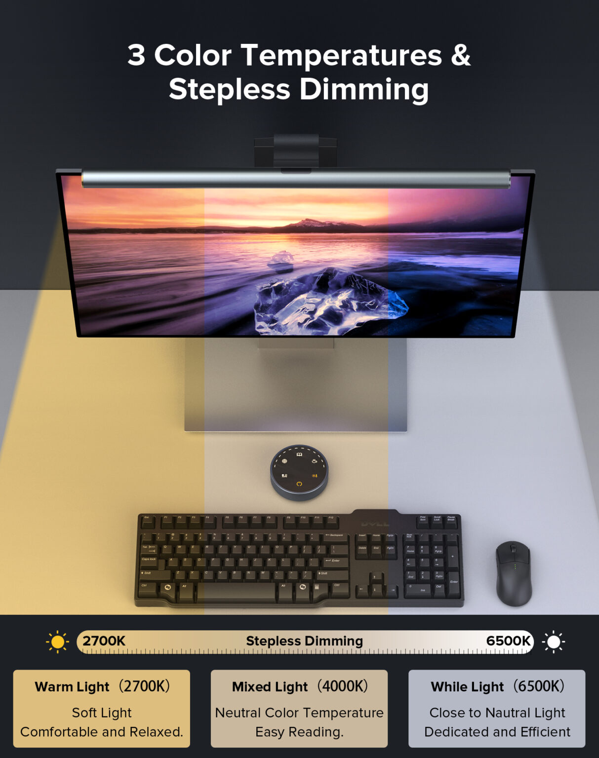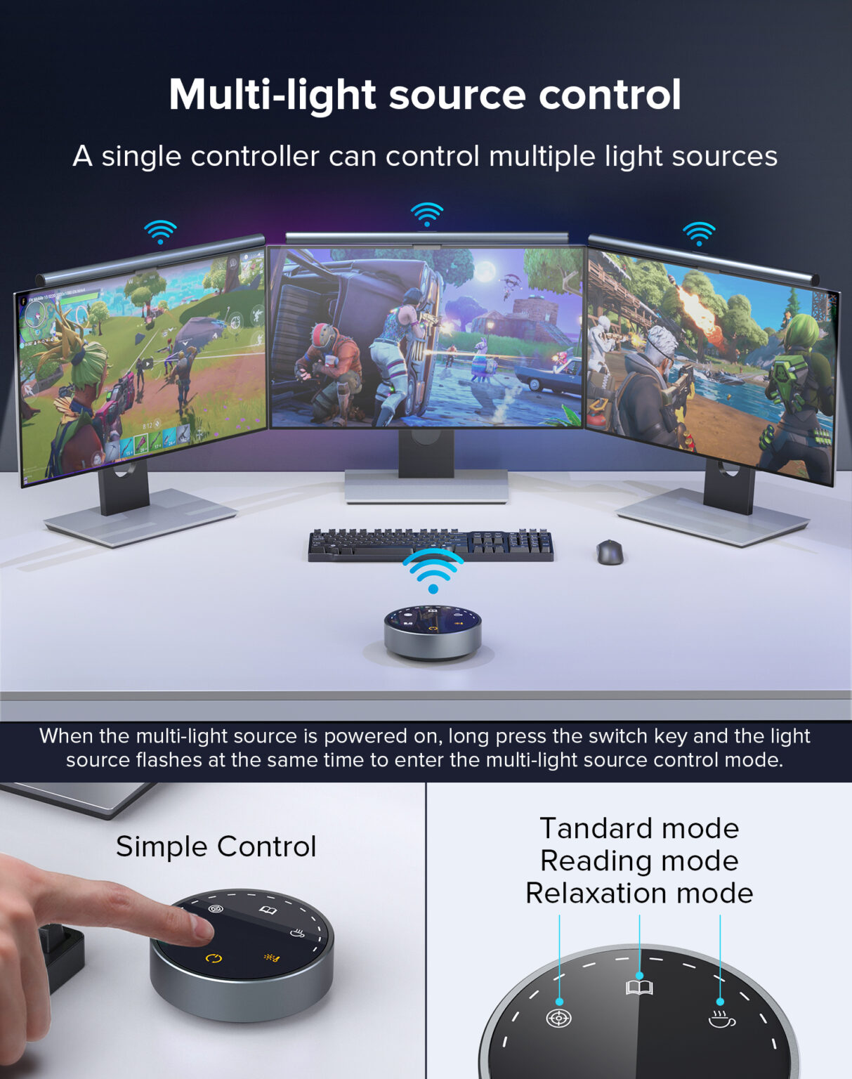 - Bạn có thể dễ dàng điều chỉnh nhiệt độ màu và độ sáng của đèn thông qua nút cảm ứng trên remote thông minh sao cho phù hợp với nhu cầu sử dụng. Điều khiển từ xa sử dụng công nghệ kết nối không dây 2.4HZ đề điều chỉnh nhiệt độ màu và độ sáng theo ý muốn. Ngoài ra, bộ điều khiển có thể điều khiển cùng lúc 3 đèn cùng lúc, rất tiện lợi nếu bạn sử dụng cùng lúc 3 màn hình.